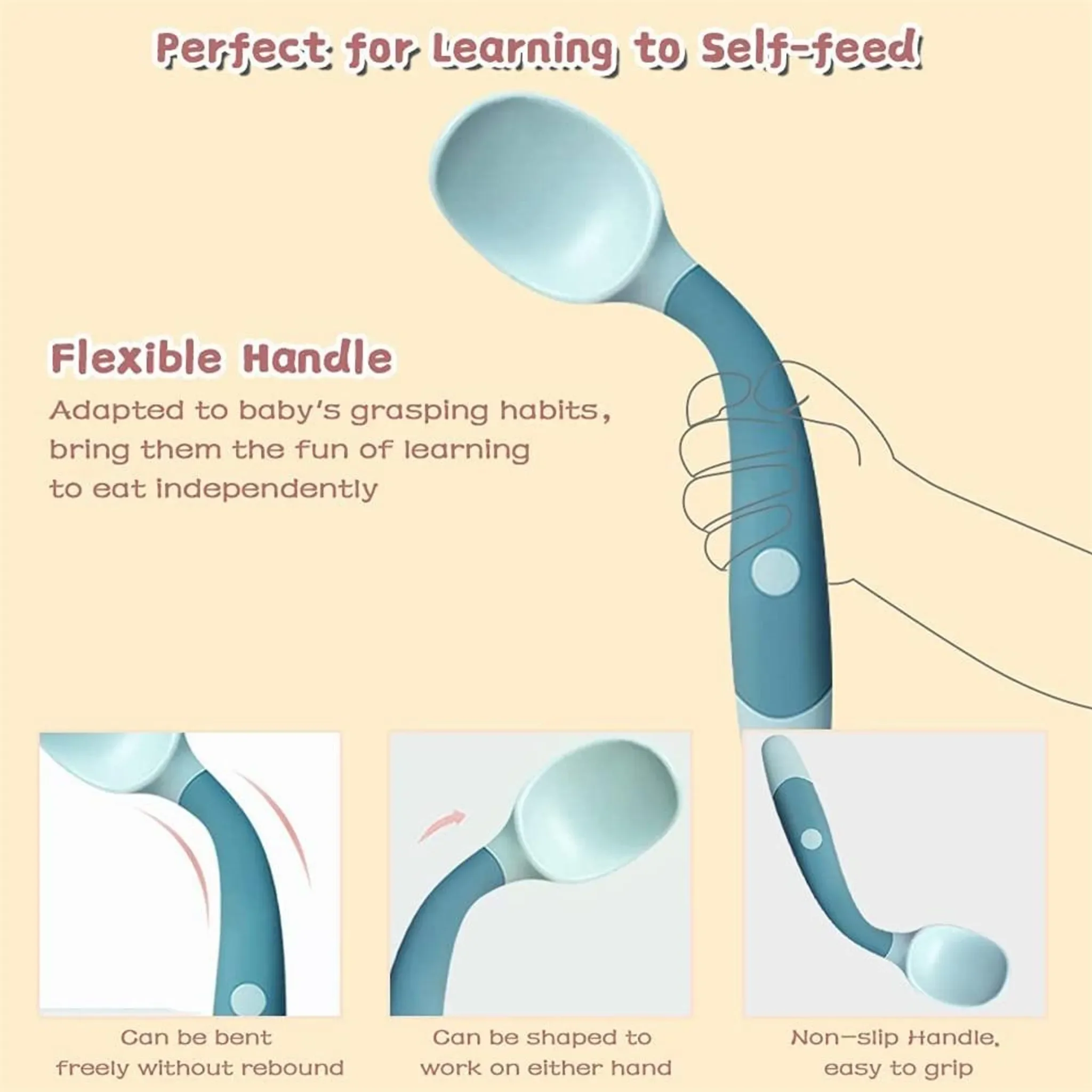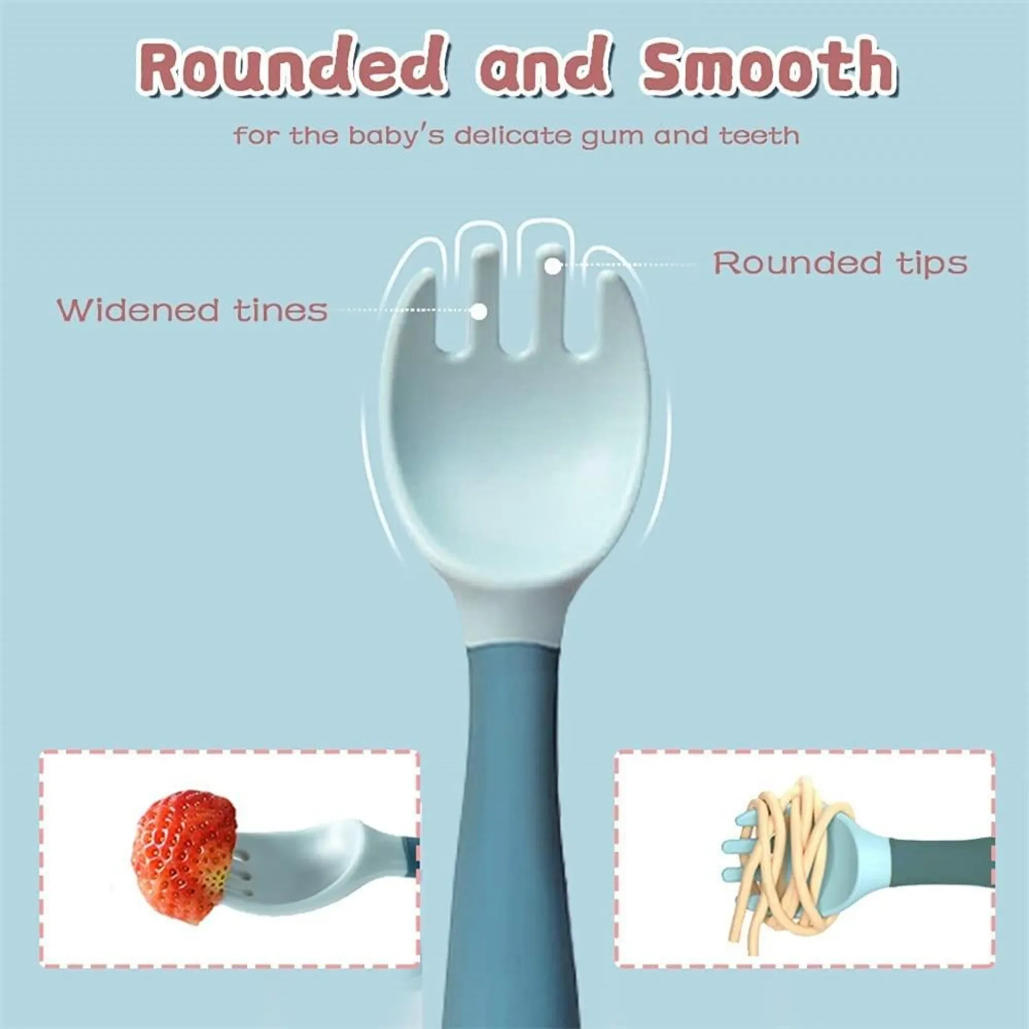 Highlights: Weiche, abgerundete Spitzen ohne scharfe Kanten, flexibel biegbar für jede Essposition, rutschfester Griff für kleine Hände, unterstützt selbstständiges Essenlernen.