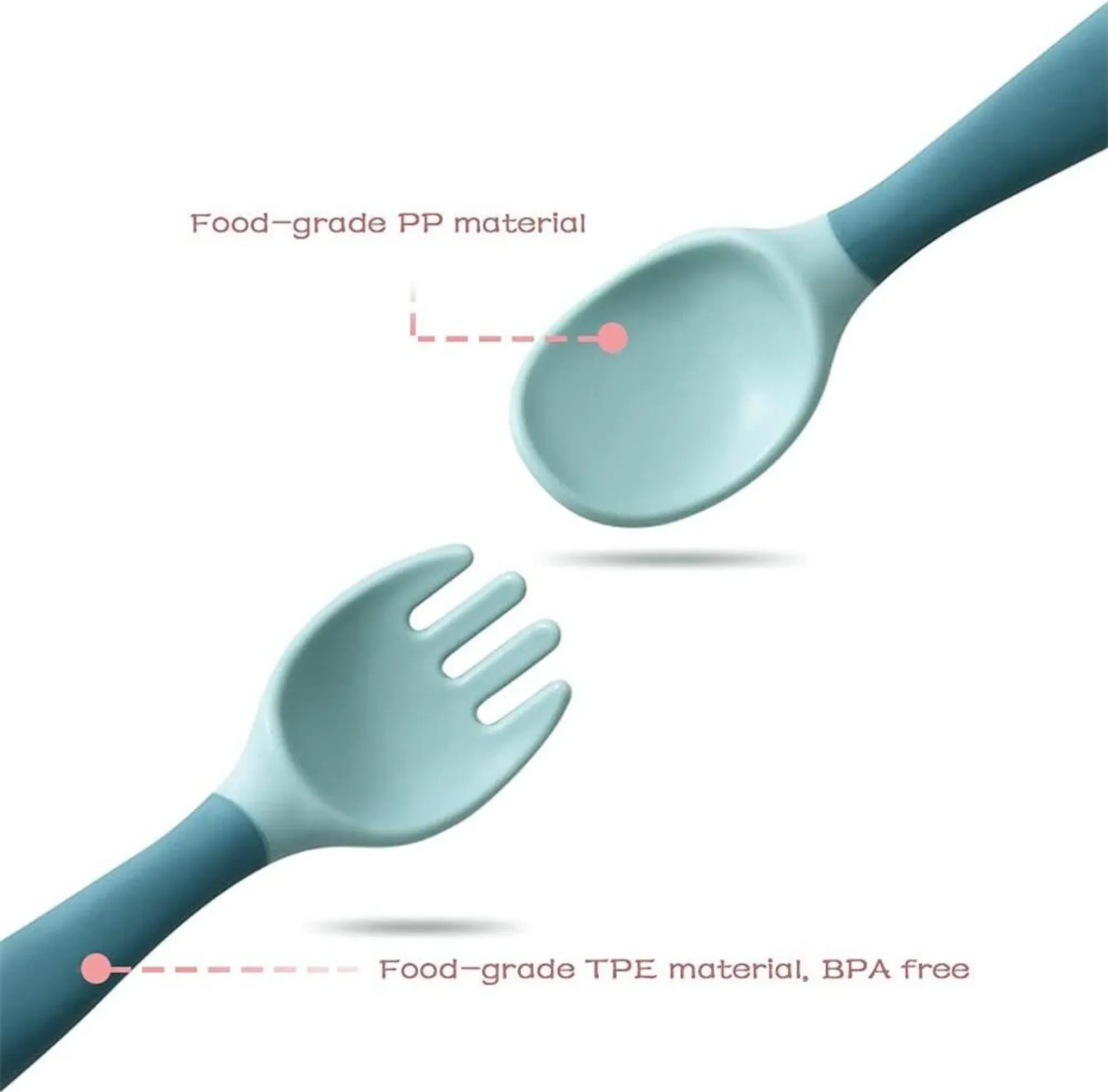 Dank des flexiblen Schafts lassen sich Löffel und Gabel in nahezu jedem Winkel biegen, wodurch sie sowohl für Rechts- als auch für Linkshänder geeignet sind. Das weiche, lebensmittelgeeignete Material schont empfindliches Zahnfleisch und sorgt für ein sicheres Essvergnügen ab dem Beikostalter.