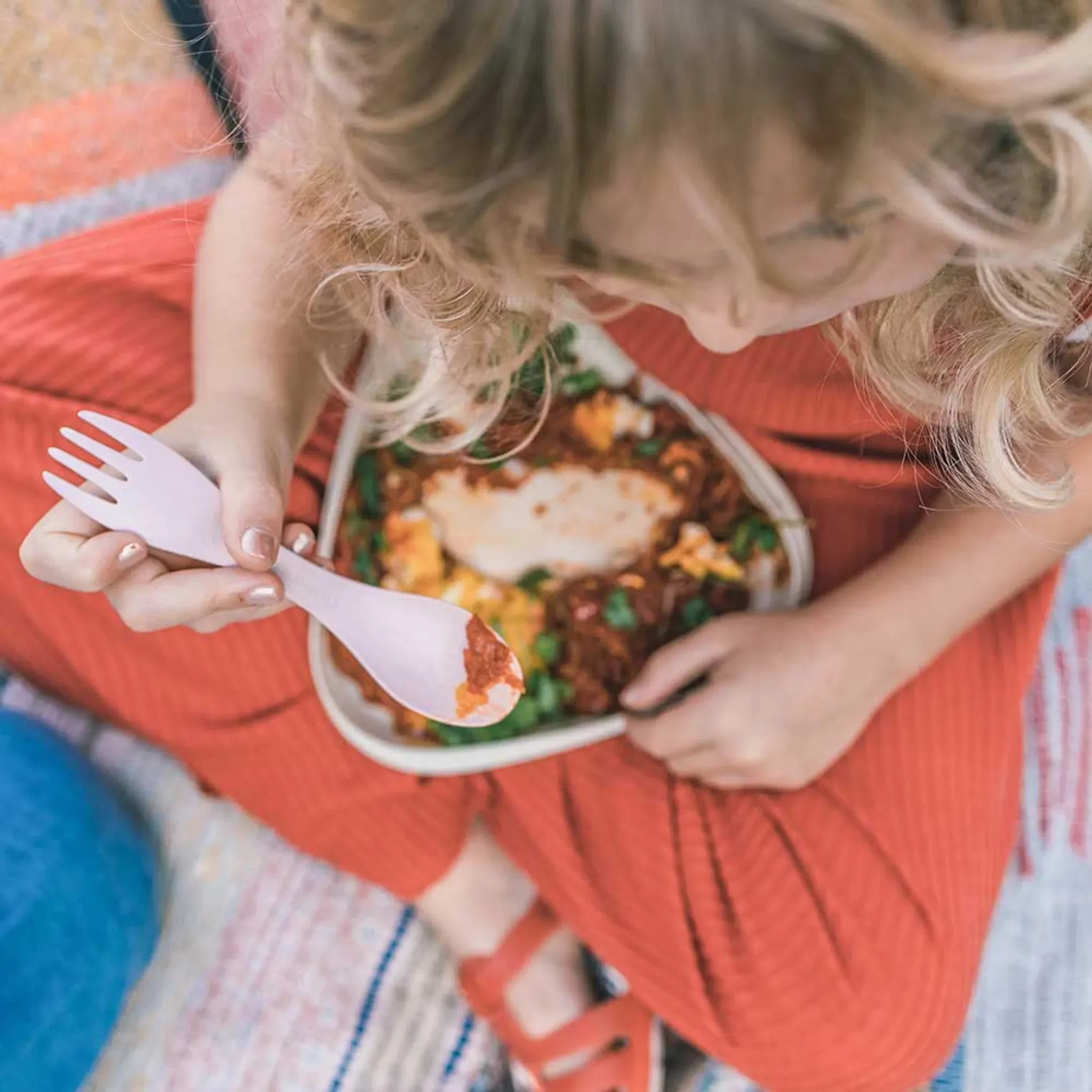 Dank des ergonomischen Designs liegt der Spork gut in der Hand und ist besonders leicht. Die Zinken der Gabel ermöglichen einfaches Schneiden weicher Speisen. Hergestellt aus biobasiertem, BPA-freiem Kunststoff, ist das Besteck umweltfreundlich, langlebig und wiederverwendbar – eine nachhaltige Alternative zu Einweg-Plastikbesteck.
