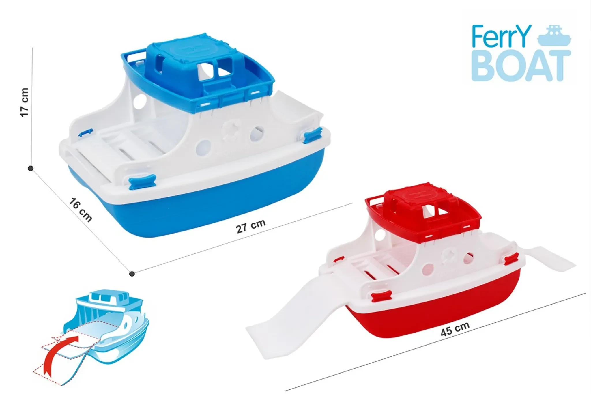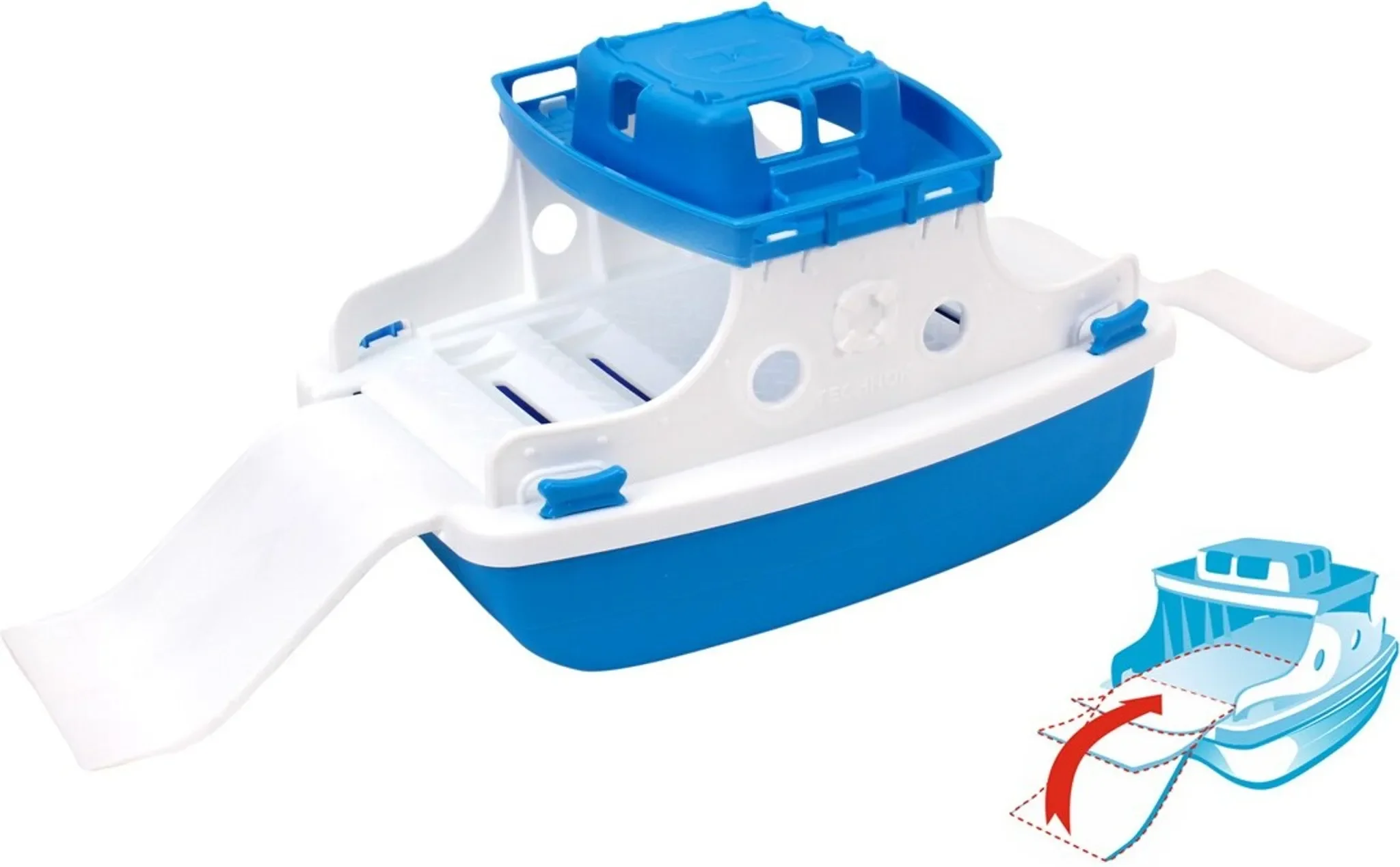 Highlights: Großes schwimmfähiges Motorboot, clevere Rampen für Fahrzeuge, leicht zu reinigen durch Wasserablauföffnungen, fördert Fantasie, Motorik und Rollenspiel.