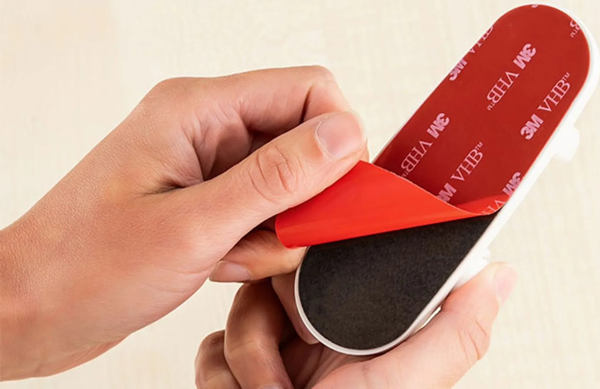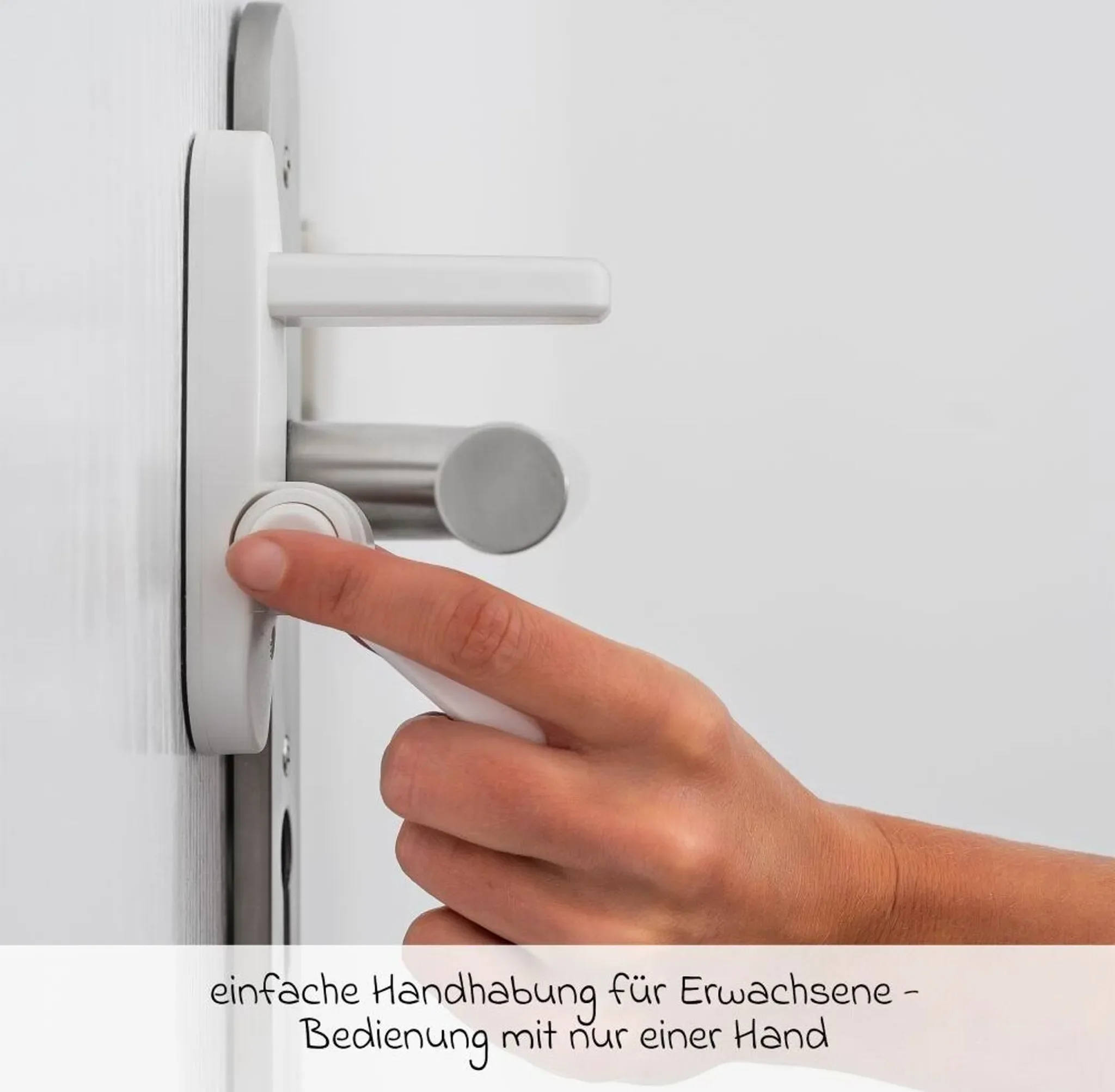 Erwachsene entriegeln die Sicherung bequem mit einem 2-fach-Mechanismus und nur einer Hand. Die Montage erfolgt werkzeuglos über das bereits installierte 3M-Klebeband – rückstandslos entfernbar, langlebig und unauffällig im Alltag.