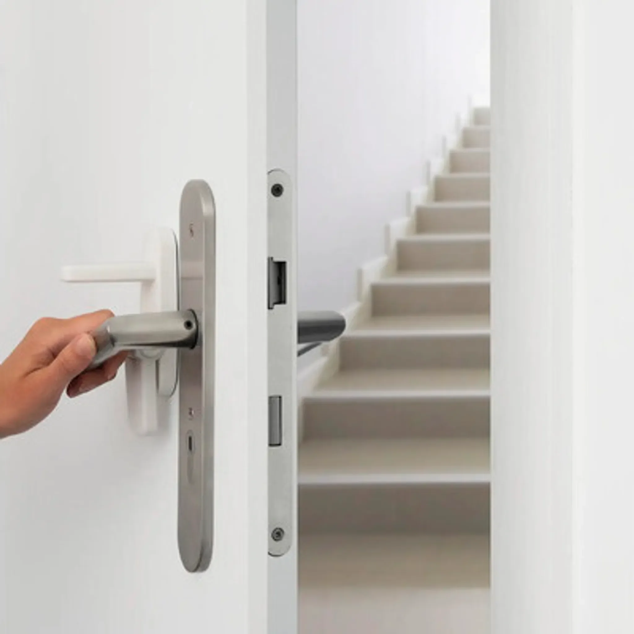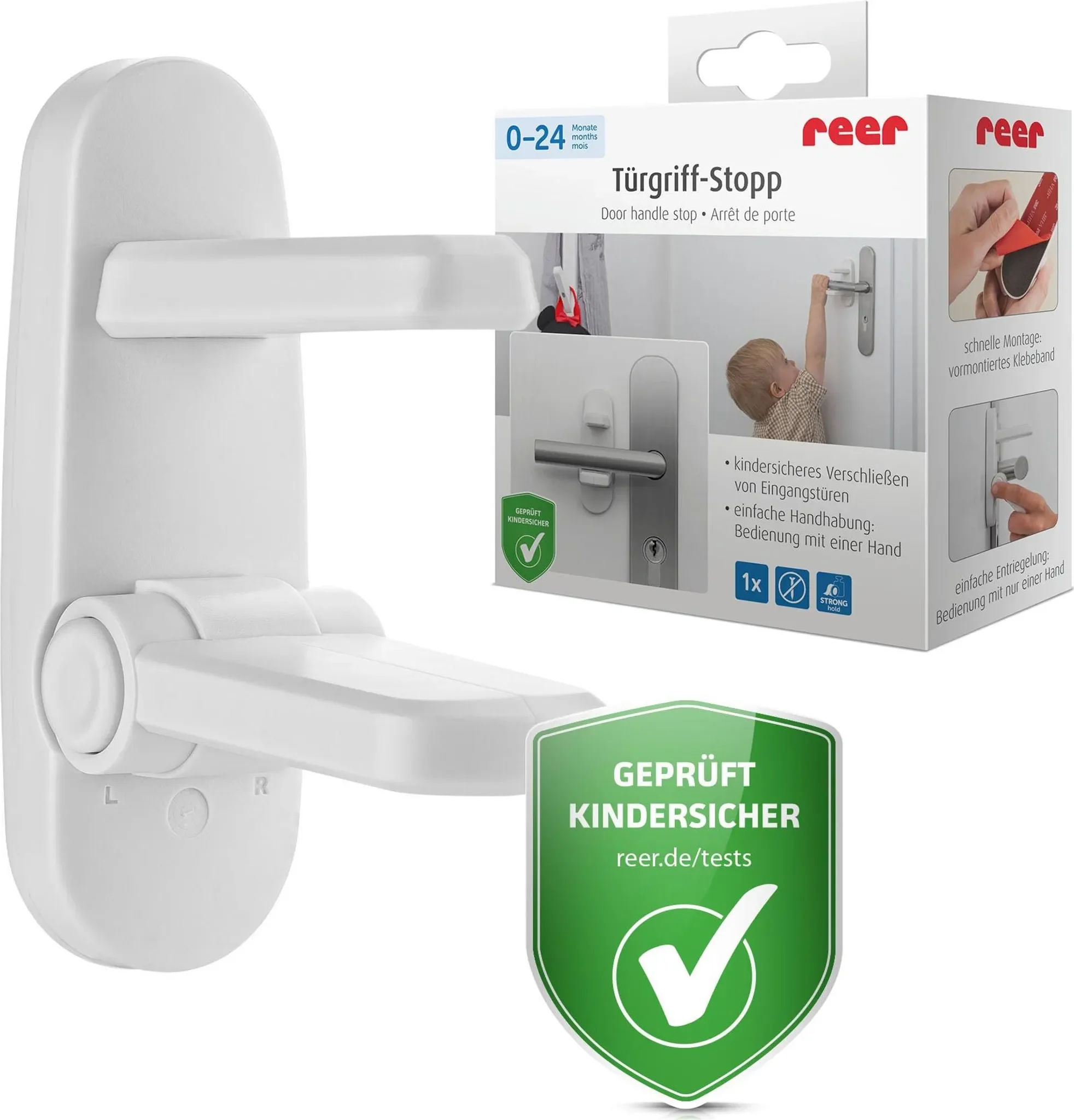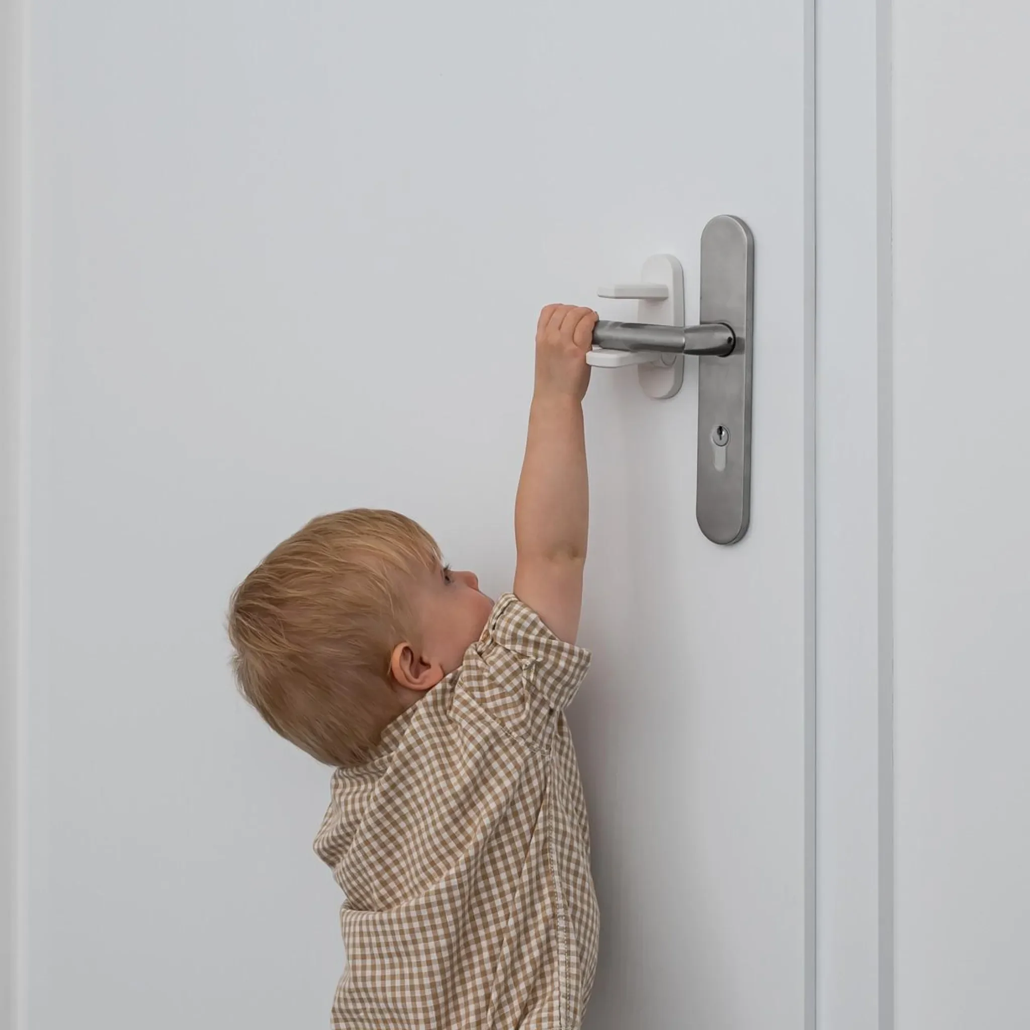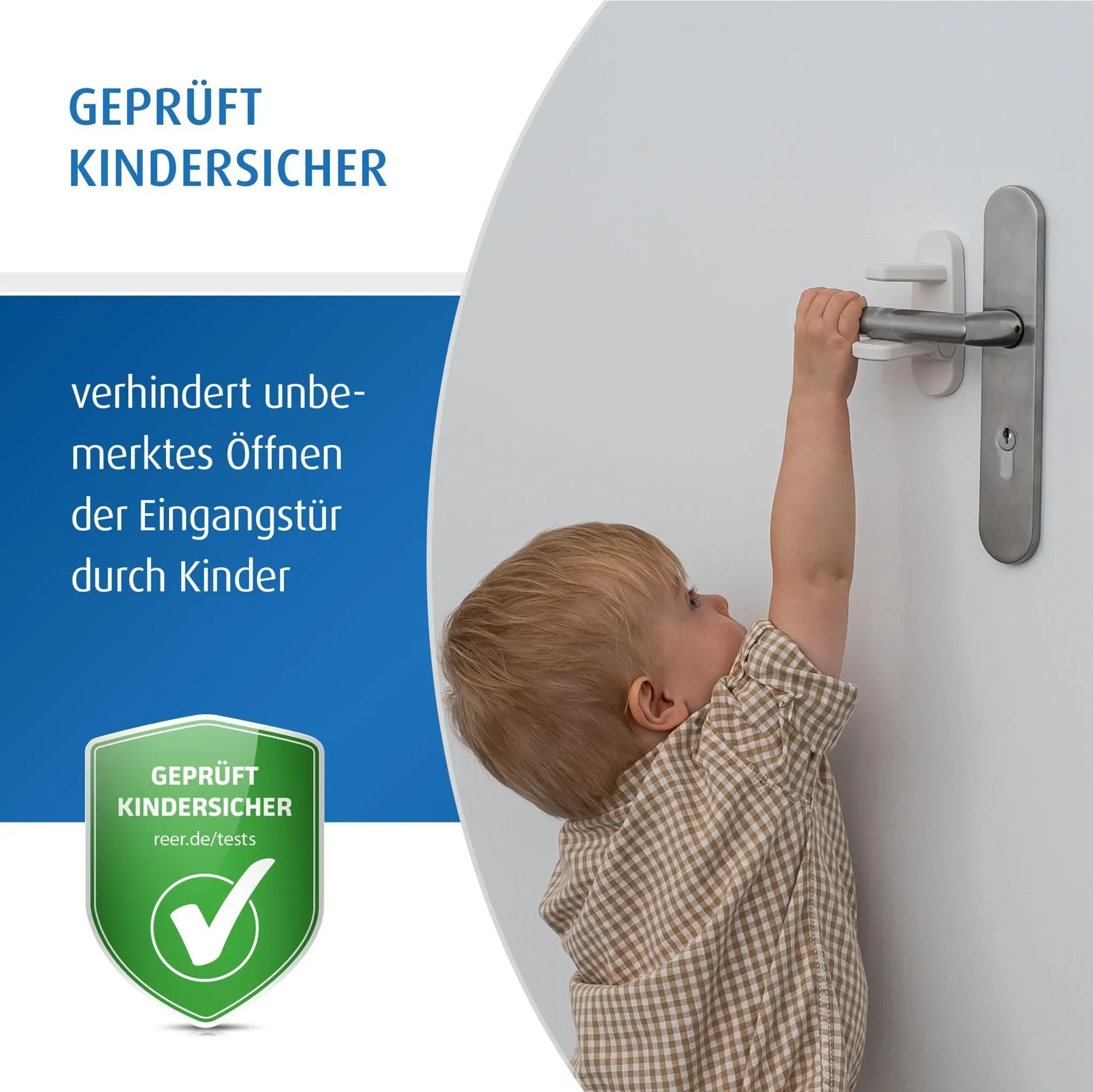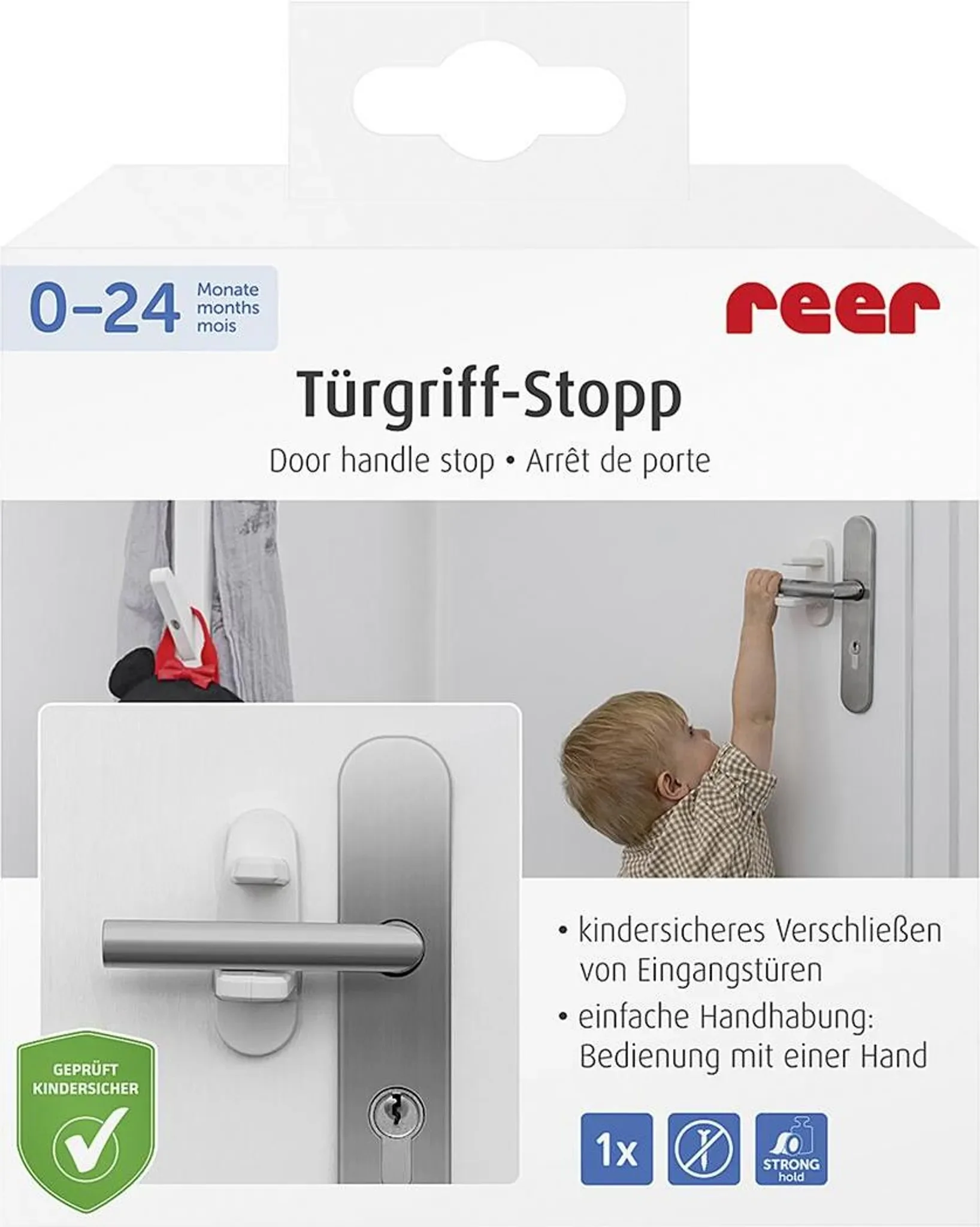 Der reer Türgriff-Stopp verhindert, dass Kinder Türen unkontrolliert öffnen oder unbeaufsichtigt Räume verlassen. Ideal zur Sicherung von Wohnungs- und Eingangstüren und hilfreich in der Entdeckungsphase kleiner Kinder, um Unfällen etwa durch Treppen oder Außenbereiche vorzubeugen.
